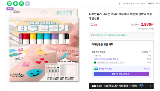과제 제목 양식✍️ [가룡이] 스마트스토어 챌린지 Day2_팔리는 상품명, 키워드, 이미지 만들기 1. 내가 만든 팔리는 상품명과 키워드를 적어보세요✏️ 기본 상품명 내가 줄인 상품명 관련 키워드 5개 내가 그리는 타투만들기 세트_가성비 그리는 타투만들기 DIY키트 타투스티커제작 어린이타투 캐릭터타투 만들기재료 2. 대표이미지와 겹치지 않는 이미지를 캡처