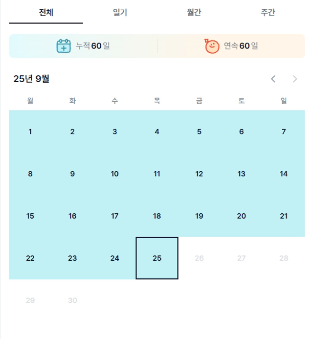 STEP1. 57일차~60일차 목실감 인증 목실감 - 통계 - 주간/월간으로 들어가 이번주 나의 목실감 현황을 인증해주세요 STEP2. 60일간 함께한 동료들에게 한마디 챌린지 마지막을 앞두고 함께 도전한 동들에게 응원의 한마디 남겨주세요😊 다들 정말 고생 많으셨습니다~ 🙏 60일 동안 함께하면서 많이 배우고 저 자신도 성장할 수 있는 소중한 시간이었어