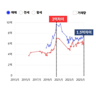 매수하자마자 손해 보지 않는 투자 지역의 위상이 높고 가치있는 단지가 시장 상황이 어려워지면서 가격이 많이 떨어지는 시기가 있다. 타지역 단지와 비교해 보면 상승장에서 3억 차이로 벌어졌던 단지가 가격조정을 받으면서 1억 5천 차이로 좁혀진 상황 단순한 가격 격차가 아닌 투자자 입장에서는 이 순간이 매수함과 동시에 1억 5천이라는 안전마진을 확보하는 투자가