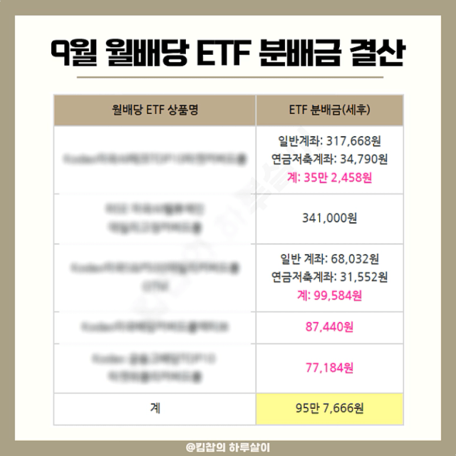 온라인 건물주, 세후 95만 원 현금 만들어준 월배당 ETF 포트폴리오 공개 시드를 팍팍 늘리고 있는 나의 월배당 ETF 투자..! 올해 안에 100만 원 현금흐름 만들기를 목표로 삼았었는데 이 흐름대로라면 10월달엔 세후 100만 원 ETF분배금 가능하겠더라고요. 온라인 건물주 등극한 9월 월배당 ETF 투자일기 지금부터 시작..! 월배당 ETF 든든한