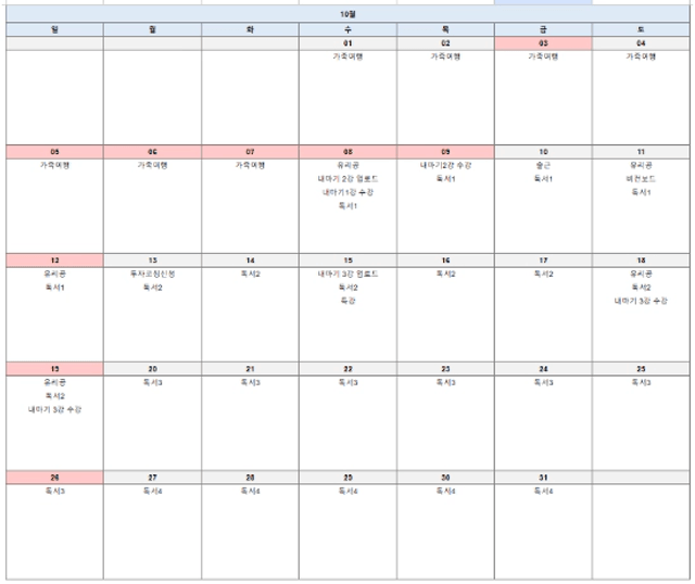 안녕하세요. 정말 오랜만에 정규 강의를 듣기 시작하며 다시 새롭게 시작하는 마음으로 계획을 작성해보았습니다. 이제는 혼자가 아닌 예비 배우자와 함께 공동의 목표를 세우며 목표를 향해 같이 열심히 달려가겠습니다! # 9월 복기 결혼준비 하며 정신없이 보냈지만 최소한의 투자 루틴을 가져갔습니다. 독서는 부족한 듯 하여 2권에서 4권으로 늘렸습니다. (9월