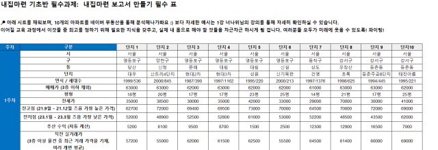 1️⃣ 열심히 작성해본 내집마련 보고서 2주차 돈-예산 PART(PPT 양식에 맞추어) 화면 캡쳐 이미지 첨부해주세요! 2️⃣ 10개 단지의 교통, 환경, 학군 핵심 기준에 따라 가치 분석 작성 & 임장 후보 아파트 선택 후 캡쳐하여 업로드 3️⃣ 스스로 작성하면서 느낀점을 한 줄이라도 적어봅시다 :) 앞으로 어떤 부분을 보완할 수 있을지, 어떻게 나아가면