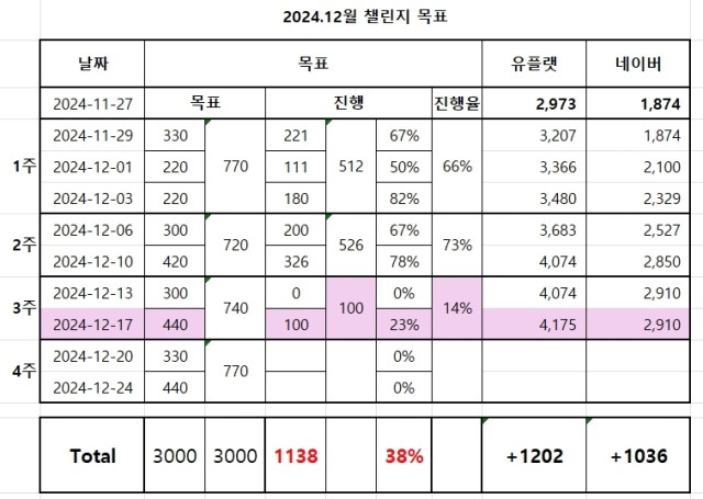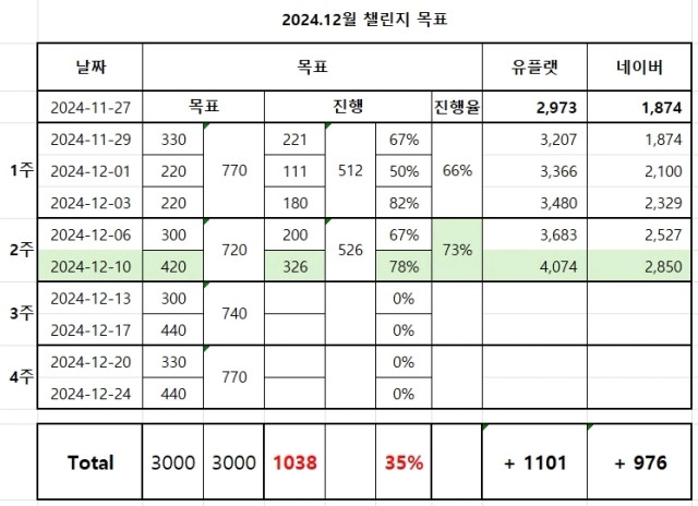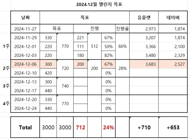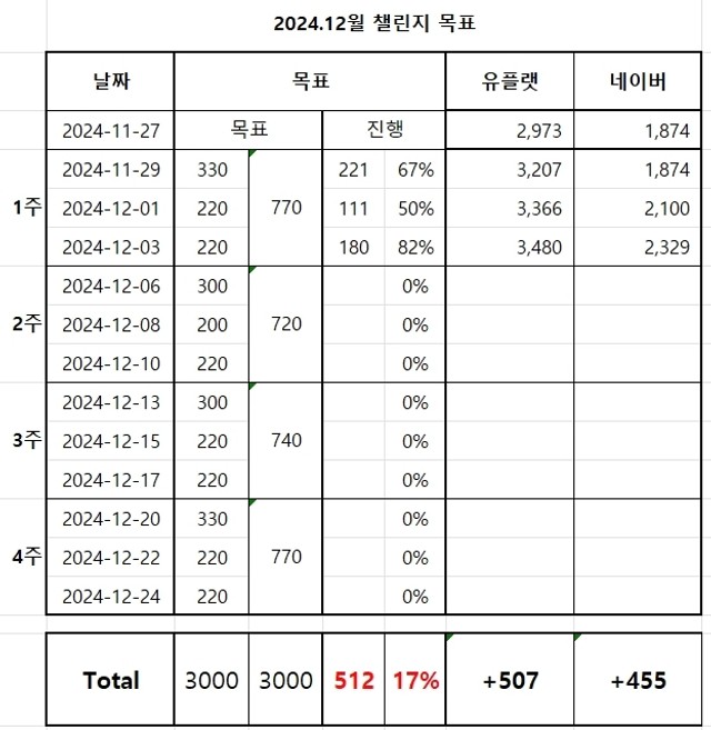 오만DB의 매출업 챌린지 워밍업🔥 1단계 : 챌린지 시작 전, 현재 등록 상품 수 인증하기 유플랫 : 2,973 스마트스토어 : 1,874 2단계 : 챌린지 계획 작성하기 1주차 : 750개 이상 2주차 : 750개 이상 3주차 : 750개 이상 4주차 : 750개 이상 [1주차] _ 계획 (하루 110개 이상) 11/27 ~ 11/29 330개 이상 가