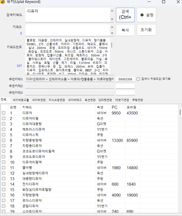유키에서 키워드 검색할 때, 1번 디퓨저에는 PC/모바일 검색수가 9950, 43500으로 나와있는데, 2번 디퓨저리필은 왜 공란으로 되어있는건가요? 반면, 디퓨저리필로 다시검색했을때 검색량은 PC/모바일 각각 270, 1460으로 나와있어서 혼란스러워요ㅠㅠ 다들 검색량 확인하고 키워드 추가하시나요?