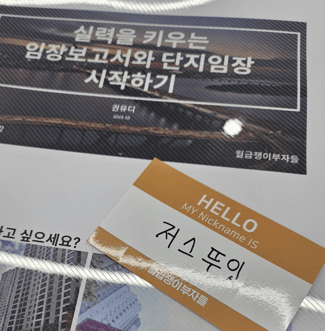 안녕하세요!! 목표까지 끝까지 가고싶은 끝간입니다! 올해 오프강의 참여가 어려울 것이라고 생각했는데 운 좋게 연휴에 초대되어 다녀왔습니다! 권유디튜터님과 루나님 같은 목표로 공부하고 계시는 동료분들을 만나뵙게되어 영광이었습니다! +빙고도 재미있었습니다! 이번 강의에서는 시세까지 임보쓰는 법과 단지임장을 어떻게 하는지 그리고 ‘왜’ 해야하는지 배웠습니다! 이