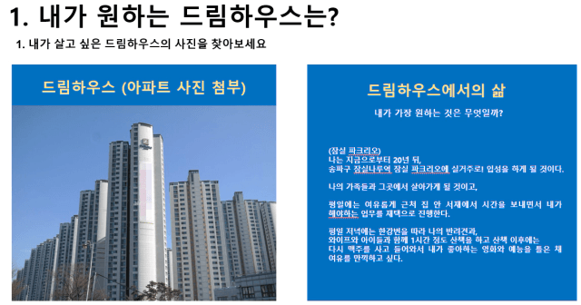 과제 제목 양식 ✍🏻 [닉네임] 내집마련 기초반 1주차 / My Dream House Project (드림하우스 프로젝트) 🏠 1️⃣ 내가 원하는 드림하우스는? 2️⃣ 드림하우스 프로젝트 플랜 (로드맵) 3️⃣ 3.3.3 계획표 ‘임장’ 칸 → ‘3개 구’ 작성하여 계획표 캡쳐 후 사진 업로드