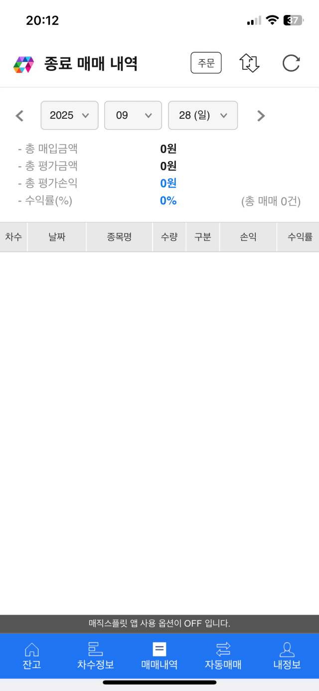 매직스플릿 인증 매직스플릿 APP 하단 메뉴에서 아래 중 하나를 선택해 캡처해 주세요! [매매내역] → 수동 + 자동 매매 내역이 모두 표시됩니다. [자동매매내역] → 자동 매매 내역만 표시됩니다. 두 메뉴 중 편하신 걸로 캡처하시고, 버튼으로 통해 사진 올려주시면 됩니다 😊 종목 노출을 원치 않으시면 모자이크 혹은 가리기 처리 후 업로드 해주세요! 과제