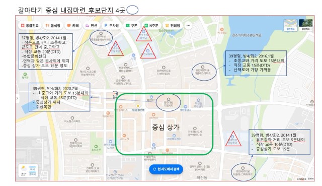 강의를 최대한 저의 상황에 맞춰 활용하려고 갈아타기 할 내집으로 후보군을 작성했습니다. 최우선 고려조건은 직장과의 거리>학군>편의시설 순으로 4곳을 선정해서 한눈에 비교할 수 있도록 그려보았습니다.