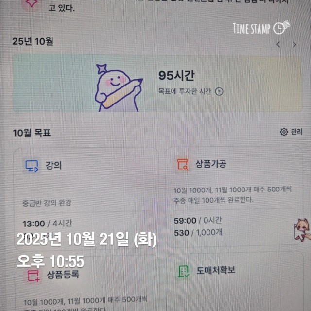 1. 스스쿠팡 기초반 수강 이후 달라진 점 나 자신을 믿고 매일 꾸준히 상품가공을 하면서 운동도 규칙적으로 하고 활기찬 사람이 되었다. 2. 스스로에게 칭찬하고 싶은 점 그만 두고 싶은 유혹에도 잠시 쉬고 컴터 앞에 앉아서 상품 가공을 하고 산책하는 시간을 즐기게 되었다. 매일 목실감 작성과 감사일기를 쓰면서 내면이 단단해져 가고 있음을 느낀다. 3. 앞으