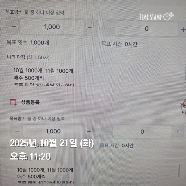 ✅챌린지 시작 전, 현재 등록 상품 수 인증하기 Q. 구글 폼 제출 완료하셨나요? (링크 10/14 안내 예정) 네 (구글폼 제출을 완료하셨다면 ‘네’ 로 기재하고 2단계로 넘어가시면 됩니다^^) 1. 한 달간 총 목표 등록 수: 1000개 2. 주차별 목표: - 1주차 _500개 / 2주차 _500개 / 3주차 _500개 / 4주차 _500개 3. 시간