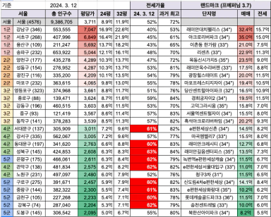 [30억부쟈] 전국 전세가율 & 평당가 (3월 12일 기준)