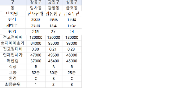 3군임에도 강동구 암사동의 아파트가 2군의 아파트들에 비해 가성비가 뛰어나다는 결론을 얻게 되었다. 광진구의 아파트는 역세권이 아니라 교통이 아쉬웠고, 성동구의 아파트는 연식이 오래되어 매전갭의 차이가 느껴졌다. 강동구의 아파트를 매수하여도 괜찮겠지만, 추후 광진구나 성동구의 아파트도 매전갭이 조금만 더 줄어들면 충분히 매수가 가능할 듯 하여 계속해서 시세