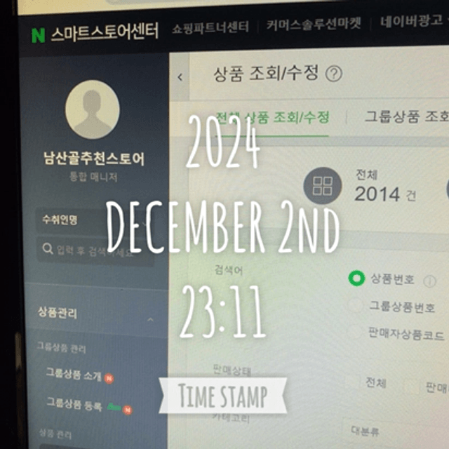 첫번째 매출업 챌린지 미션 인증 [Before] 지난주 상품 등록 수: 1854개 [After] 현재 상품 등록 수: 2014개 (+160개) 목표 달성률 : 15.3% [인증 사진 첨부] ※ 일자와 시간까지 함께 기록할 수 있는 ‘타임 스탬프’ 어플을 활용해 인증 사진을 촬영합니다.