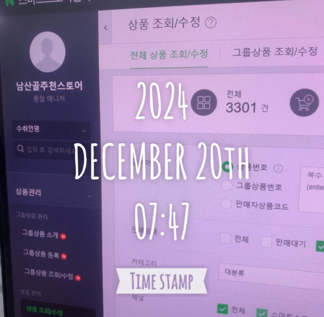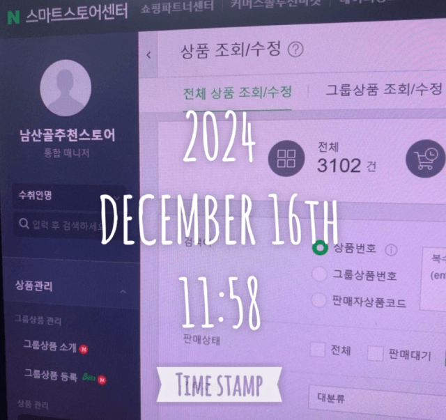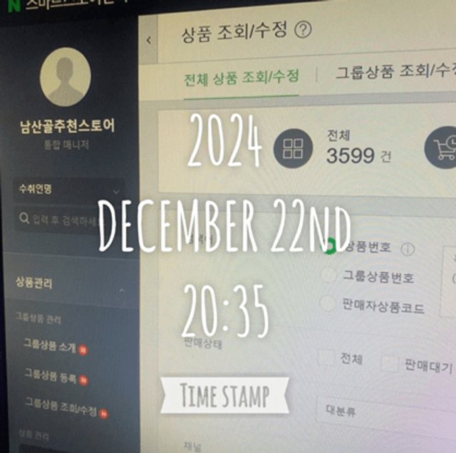 (남산골부자)의 매출업 챌린지 N주차🔥 첫번째 매출업 챌린지 미션 인증 [Before] 챌린지 시작 전 상품 등록 : 2215개 [After] 현재 상품 등록 수: 2414개(+199개) [Final] 최종 목표 달성률 : 28.9% (=현재 누적상품 등록수/3000개) *100) [인증 사진 첨부] ※ 일자와 시간까지 함께 기록할 수 있는 ‘타임 스탬프
