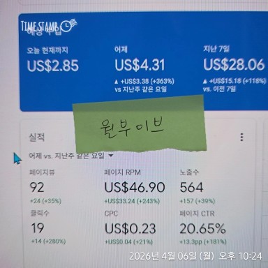 [아쿠아원] 4.6 애드센스 수익 인증 챌린지 75일차