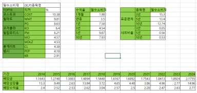 미국주식 필수소비재 섹터 TOP10 배당금과 배당성장률, 배당수익률