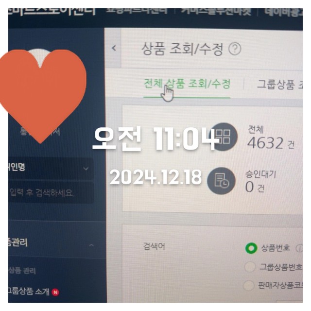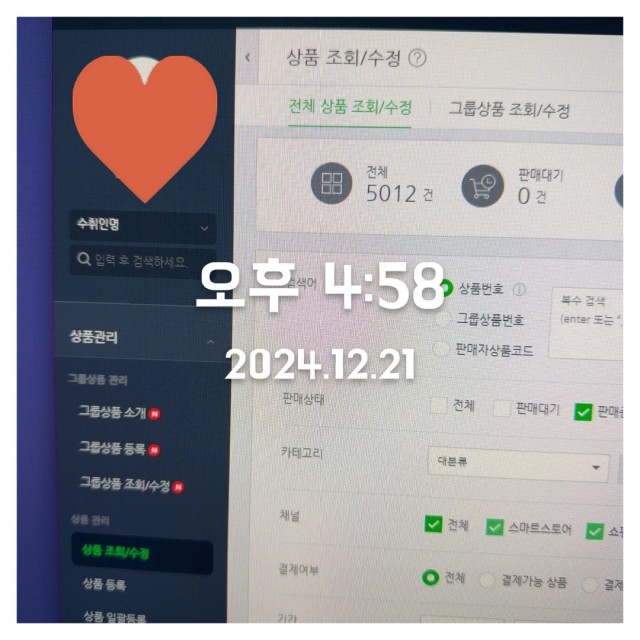 [Before] 챌린지 시작 전 상품 등록 : 1974개 [After] 현재 상품 등록 수: 5012개 [Sum] 현재 누적 상품 등록 수: +3010개 [Final] 최종 목표 달성률 : 100.333% [인증 사진 첨부]