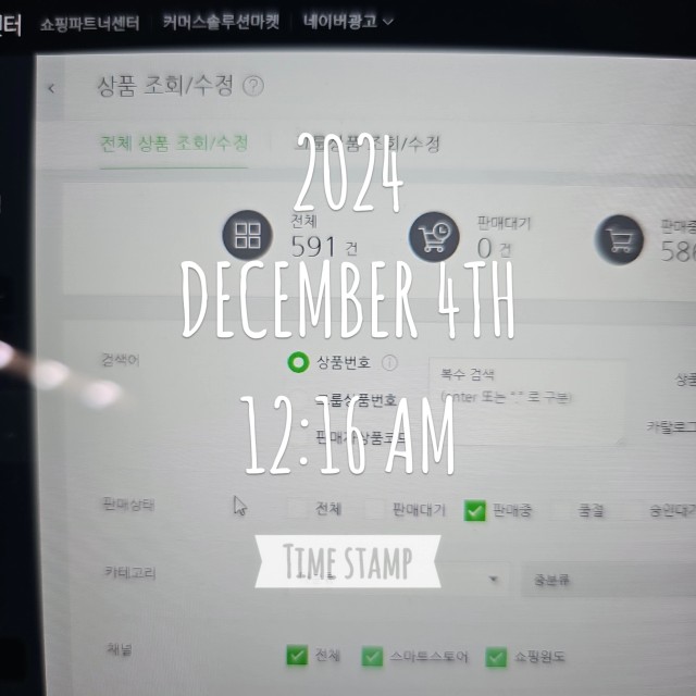 [Start] 처음 상품 등록 수: 276개 [Before] 지난주 상품 등록 수: 480개 [After] 현재 상품 등록 수: 591개 (+111개) [Sum] 현재 누적 상품 등록 수: +315 [Final] 최종 목표 달성률 : 10.5% (=3000개/현재 누적상품 등록수) *100) [인증 사진 첨부] ※ 일자와 시간까지 함께 기록할 수 있는 ‘타