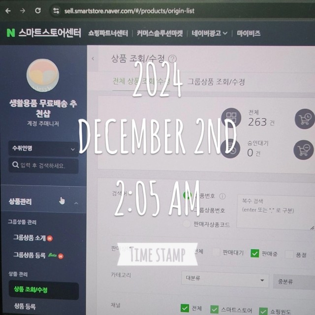 멋진견우의 매출업 챌린지 1주차🔥 두번째 매출업 챌린지 미션 인증 [Before] 지난주 상품 등록 수: 000개 [After] 현재 상품 등록 수: 263개 (+263개) 목표 달성률 : 8.7% [인증 사진 첨부] ※ 일자와 시간까지 함께 기록할 수 있는 ‘타임 스탬프’ 어플을 활용해 인증 사진을 촬영합니다.