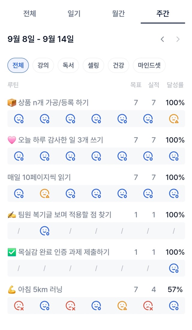 STEP1. 결과가 아닌 과정 되돌아보기 지난 2주 동안 나의 목표 실적은? ㄴ 목표보다 적은 실적 그날 목표를 잘 지킬 수 있었던 이유는 무엇인가요? (환경, 시간대, 기분 등) ㄴ 특별한 이슈 없이 루틴대로 진행된 날은 당일의 목표를 지킬 수 있었다 목표를 달성하기 어려웠던 이유는 무엇인가요? (외부 요인, 계획 오류, 피로 등) ㄴ 예상치 못한 이슈와