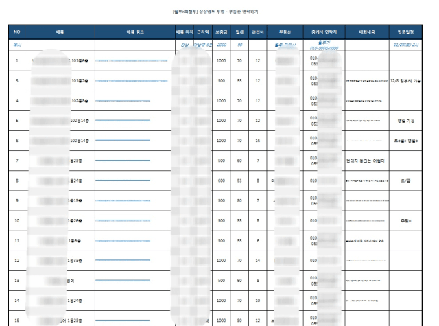 1) 필수 첨부 사진 : 부동산 명함, 매물 내부 사진 1~2장 2) 계약 여부 : X 한번은 등기부등본 문제가 있어서 계약을 물렀고, 다른 매물들은 대부분 전대동의 문제가 가장 큽니다. 3) 첨부드린 수익시트를 다운로드 받아 작성후 제출해주세요 첨부했습니다.