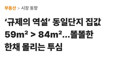 성동구 한 단지에서 59㎡가 84㎡보다 높은 가격에 거래되었습니다. 규제에 더불에 '한강 조망권'이라는 프리미엄이 불을 지폈습니다. 기사에서 언급했듯, 같은 단지라도 59㎡는 한강을 마주 보는 로열동에, 84㎡는 단지 안쪽에 배치된 경우가 많아 발생한 현상입니다. 그러나 '희소성'과 ‘고평가’는 다른 것입니다. 서울은 기본적으로 땅을 산다는 관점으로 생각하