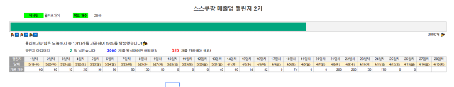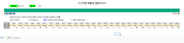 1. 이번주 나의 성장 점검표 ✅ [Before] 챌린지 시작 전 상품 등록 : 691개 [After] 현재 상품 등록 수: 2691개 [Sum] 현재 누적 상품 등록 수: +2000개 (현재 상품 등록수-챌린지 시작 전 상품 등록 수) [Final] 최종 목표 달성률 : 66.7% (=현재 2000/3000개) *100) 100%(=현재 2000/2000