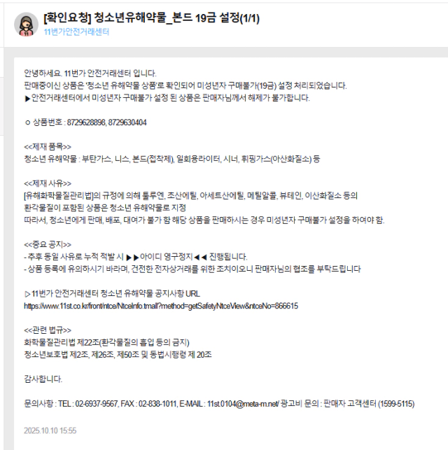 11번가에서 순간접착제 미성년자 구매불가 설정되었다고 이메일이 왔습니다