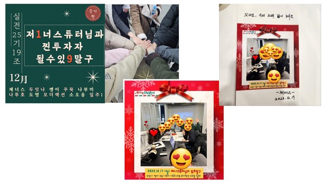 안녕하세요. 읏자읏자 두잇나 (Do it now) 입니다. 23년의 마지막 12월을 함께한 "실전25기 저1너스튜터님과 찐투자자 될수있9말구"조에 감사합니다. 마음만 앞서는 조장을 만나서 고생하신 조원분들과 뭣도 모르면서 생글 웃는 조장을 거둬 주신 "제너스"튜터님께 감사합니다.^^ 제너스 튜터님께 받은 마음과 은혜는 23년의 크리스마스 선물과도 같았습니다