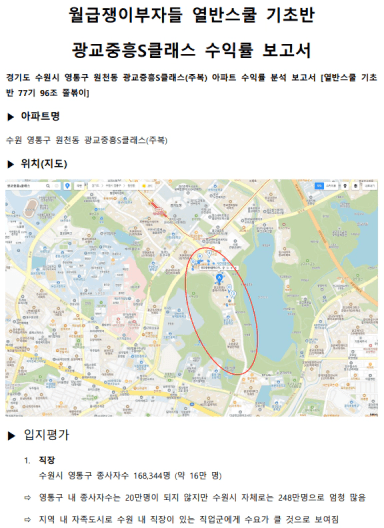 경기도 수원시 영통구 원천동 광교중흥S클래스(주복) 아파트 수익률 분석 보고서 [열반스쿨 기초반 77기 96조 쫄볶이]