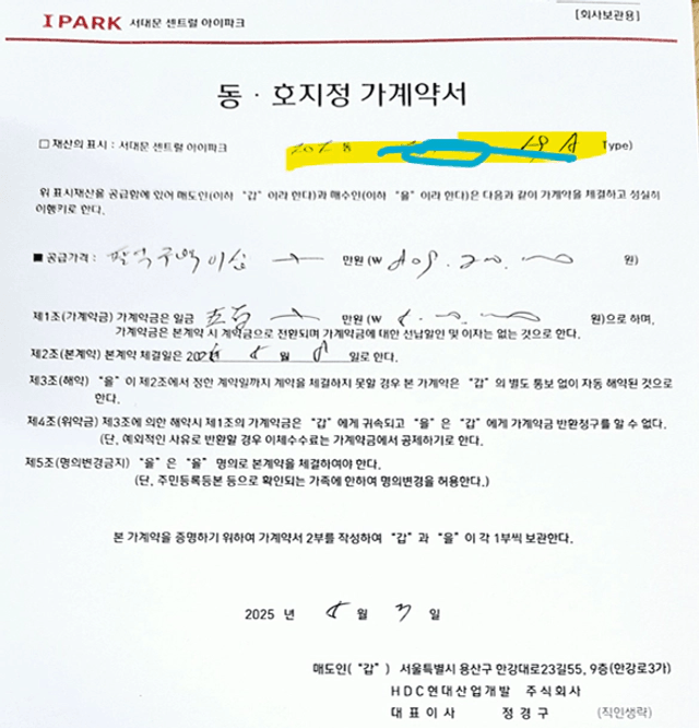 상황요약 서대문 센트럴 아이파크 59를 가계약 하고 오게 되었습니다. (가계약금 500만원, 계약금 3000만원은 5월8일까지 납부 및 서류 구비하여 계약 체결 필요, 발코니 확장은 무상이고 202동 분양가 8억 9백 20만원 시스템 에어컨은 680만원 별도 추가 부담 필요 기타 가전 등 옵션 없는 듯 구체적인 설명 없었음 중도금 이자에 대한 내용도 구체적