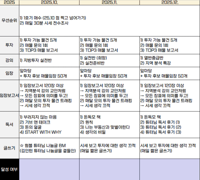 안녕하세요 온 마음을 다 해 늘 배움을 추구하는 투자자 마음철 입니다. 감사하게도 지방투자실전반에서 험블 튜터님과 열정 넘치는 동료분들과 함께 할 수 있는 기회를 얻었습니다. 최선을 다 해 한달을 보내도록 10월 계획을 짜고 튜터님 말씀대로 미친듯이 몰입하고 파고 드는 한달을 만들어보겠습니다. [25년 4분기 계획] 투자: 임장이든 임보든 목적은 투자라는