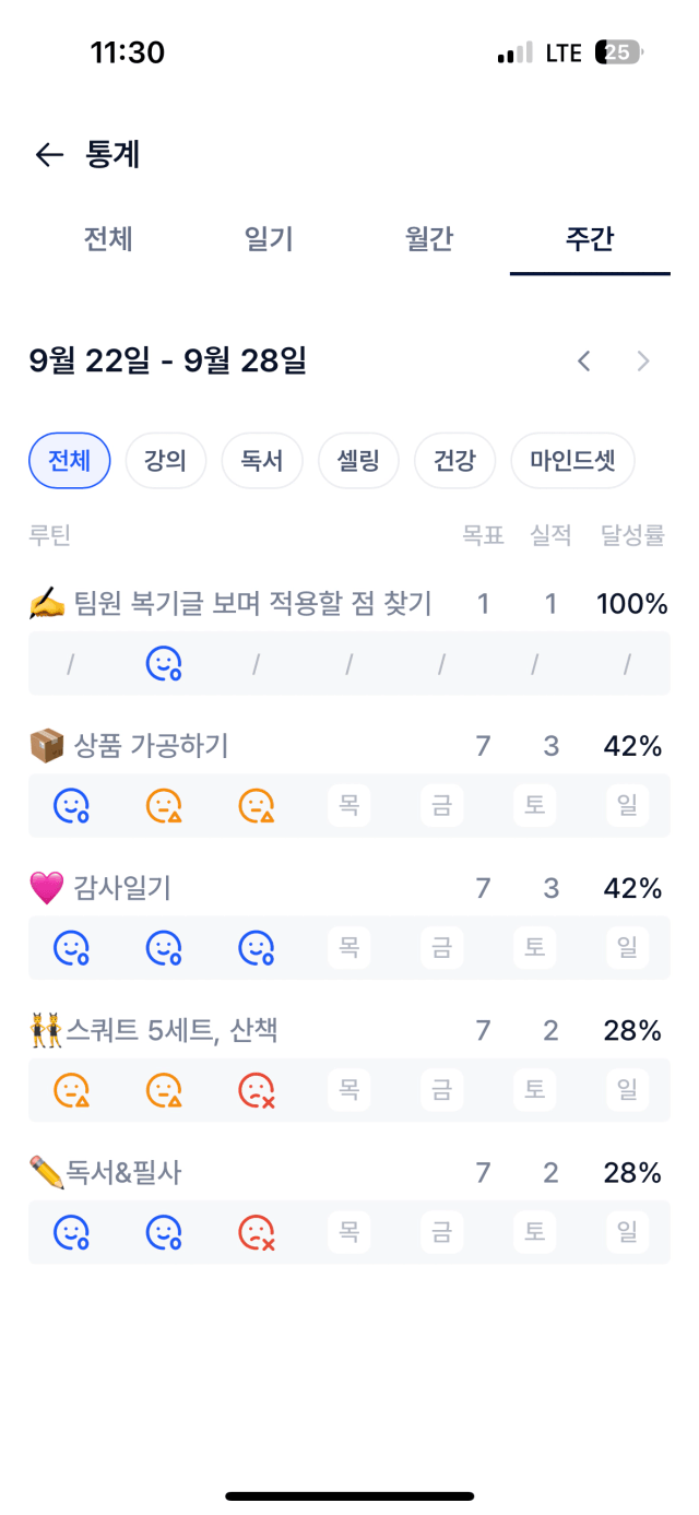 STEP1. 이번주 목실감 인증 목실감 - 통계 - 주간/월간으로 들어가 이번주 나의 목실감 현황을 인증해주세요 STEP2. 이번주 동료들에게 한마디 저는 이번주 많이 지지부진했어요. 다시 초심으로 돌어가 열심히 할게요. 지치지않고, 끝까지 잘해서 챌린지 마쳐보아요.
