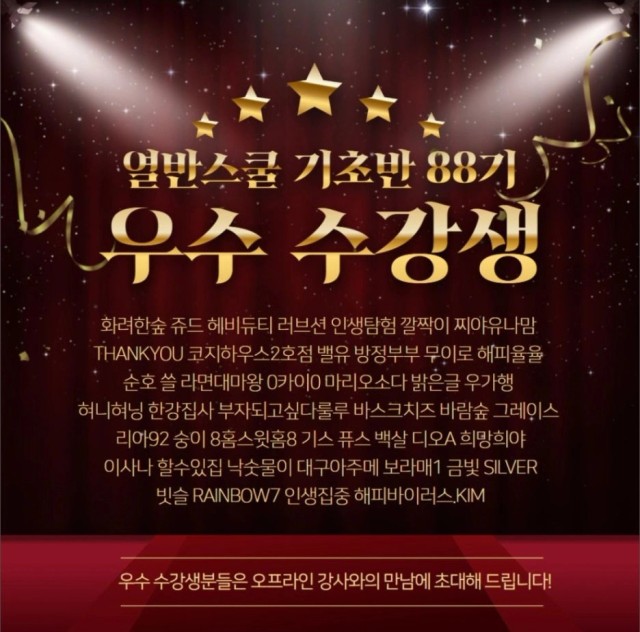 안녕하세요. 저는 이제 월부 2개월차가 되어가는 그리고, 아직은 앞마당이 하나도 없는 rainbow7입니다. 지난 9월에 실시했던 열기반 88기 중 ‘우수 수강생’으로 선정되어, 10월 10일 19시 ‘강사님과의 만남’이라는 소중한 경험을 하고 첫 강의를 들으시는 분들에게 응원을 하고자 이렇게 후기 글을 올립니다. 10월 1일 열반스쿨 기초반 끝날 무렵 먼