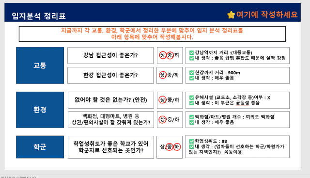 기초반 듣고 중급반 처음 들을 때는 점점 중복되는 내용이 많아져서 불만족스러웠던 부분이 있습니다. 그러나 막상 내집마련 하려고 이런저런 단지들을 비교하다보니 원점으로 돌아가는 고민들을 왜 하게 되고 어떻게 정리해서 사야할지 짚어주셔서 도움이 굉장히 많이 된 강의였습니다. QnA를 많이 가져오셔서 대답해주신 부분도 도움이 많이 됐습니다.