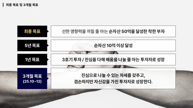 안녕하세요. 수수진입니다. 9월 한 달은 돌이켜보면 새로운 시작과 끝맺음까지 함께 경험할 수 있던 한 달이었던 것 같습니다. 9월을 제대로 복기하고 새로운 10월을 맞이해 복기 및 계획을 세워보겠습니다. 2025년 9월 OKR 실력과 마인드를 갖춘 투자자 + 독서(5/4) - 부의 전략 수업 - 나는 왜 이일을 하는가 - 스토리의 과학 - 놓치고 싶지 않은
