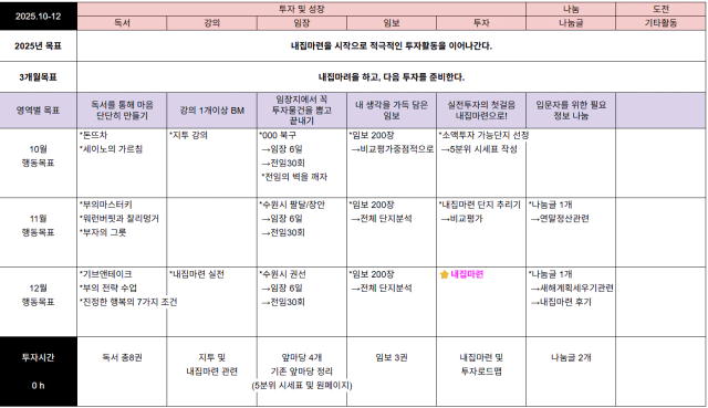 즐겁게 하루를 살아가는 워킹줌마 입니다. 복기.계획을 안쓰다보니 계획이 희미해지고, 한 달이 어떻게 지나간나 모르겠네요. 2025년 남은 3달 열심히 기록하며 목표를 바라보며 하루하루를 보내겠습니다. 9월 계획 실적 독서 계획 4 권/ 실적 4권 강의 열중강의 임장 안함 투자 안함 ❗️9월 복기 열중강의를 들었는데 자실하면서 강의 듣자라는 마음으로 강의온리