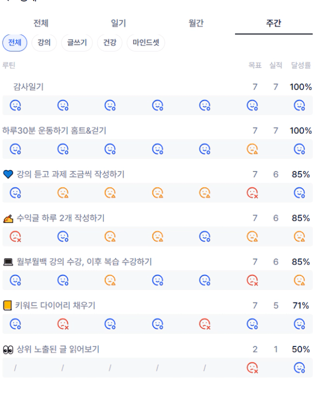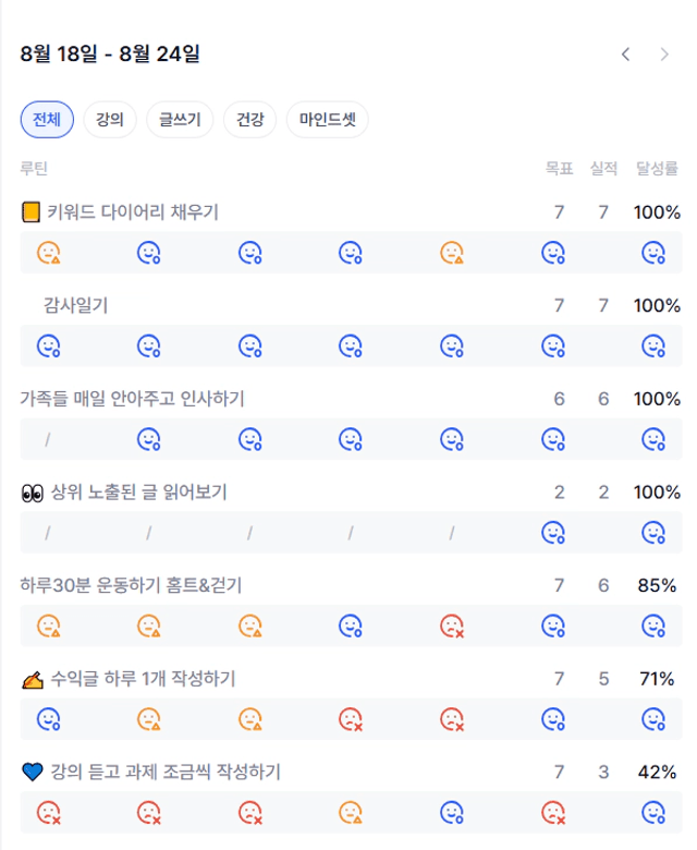 과제 제목: [닉네임] 월부월백 실전반 - 3주차 목실감 인증 및 주간 회고! (8/18 ~ 8/24) STEP1. 1주차 목실감 인증 목실감 - 통계 - 주간/월간으로 들어가 이번주 나의 목실감 현황을 인증해주세요 STEP2. 주간회고 나의 주간 실적을 확인해보며, 어떤 부분을 잘 했고, 어떤 부분이 부족했는지 스스로를 되돌아봐주세요!😊 이번주 원래 목