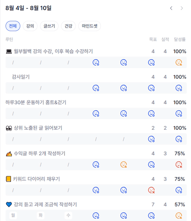 과제 제목: [닉네임] 월부월백 실전반 - 1주차 목실감 인증 및 주간 회고! (8/7 ~ 8/10) STEP1. 1주차 목실감 인증 목실감 - 통계 - 주간/월간으로 들어가 이번주 나의 목실감 현황을 인증해주세요 STEP2. 주간회고 나의 주간 실적을 확인해보며, 어떤 부분을 잘 했고, 어떤 부분이 부족했는지 스스로를 되돌아봐주세요!😊 부끄럽지만 처음