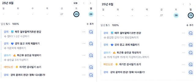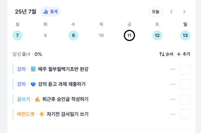 1️⃣ 이번주 목실감 인증샷! (6/30월~7/6일 7일치) 2️⃣ 이번주 목실감 작성하며 느낀점 목실감을 해야한다는 의무감이 있어서 목표치를 채우려고 하루하루 더 열심히 살아가는 거 같네요. 수업내용을 잘 들었나 한번도 뒤돌아 보게 돼고 일단은 과제라 생각돼니 ^^ ㅎㅎ 너 잘하려고 노력하는 거 같아요 남은 2주 동안도 열심히 해야돼겠네요.