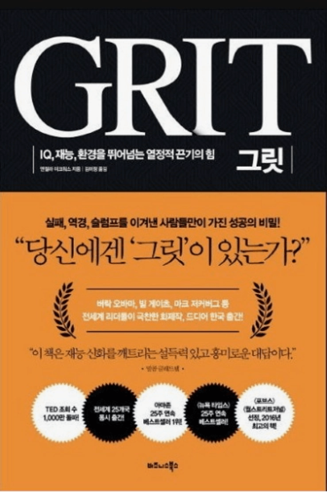STEP1. 책의 개요 1. 책 제목: 그릿 2. 저자 및 출판사: 앤절라 더크워스 3. 읽은 날짜: 9월 마지막주 4. 총점 (10점 만점): 10 / 10점 STEP2. 책에서 본 것 p.63 “최상급 기량은 사실 수십 개의 작은 기술 및 동작 하나하나를 배우거나 우연히 깨치고, 주의 깊은 연습을 통해 습관으로 만들고, 전체 동작으로 종합해서 나온 결과