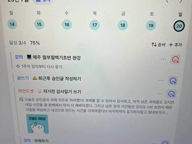 1️⃣ 이번주 목실감 인증샷! (7/14월~7/20일 7일치) 2️⃣ 이번주 목실감 작성하며 느낀점!! 어느덧 1달의 시간이 지나가고 있는데도 여전히 하고 있다는 사실이 뿌듯하다! 근데 돌아보는 것은 내가 매일 열심으로 목실감을 하고 있는지, 의무감으로 하고 있지는 않은지 돌아보게 된다. 근데 의무감으로라도 이 공부의 끈을 놓치지 않고 있다면 그래도 잘 살