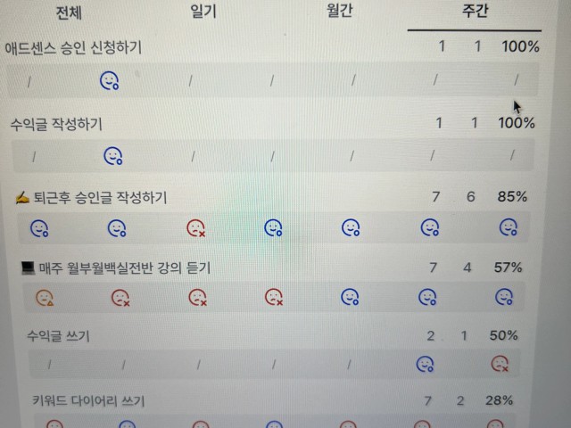 STEP1. 1주차 목실감 인증 목실감 - 통계 - 주간/월간으로 들어가 이번주 나의 목실감 현황을 인증해주세요 STEP2. 주간회고 나의 주간 실적을 확인해보며, 어떤 부분을 잘 했고, 어떤 부분이 부족했는지 스스로를 되돌아봐주세요!😊 이번주에 평소보다 많은 업무로 늦은 퇴근이 너무 많았다.. 그래서 강의를 듣거나 과제를 하거나 등 목실감에 집중하지 못