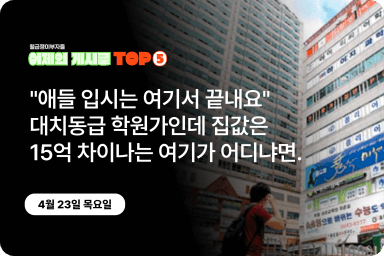 [어제의 게시글 Top5] "애들 입시는 여기서 끝내요" 대치동급 학원가인데 집값은 15억 차이나는 여기가 어디냐면..