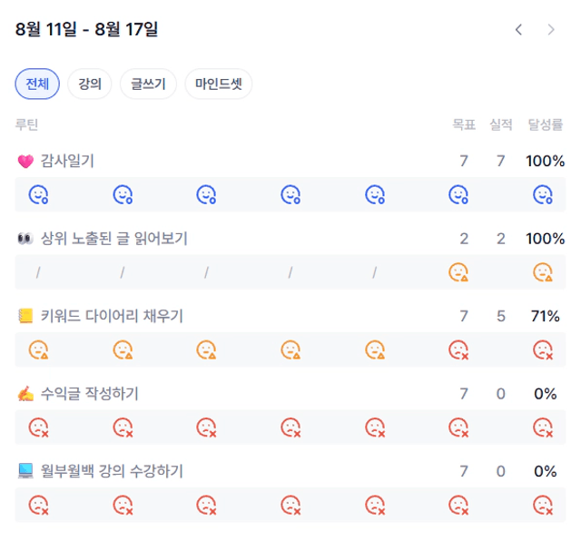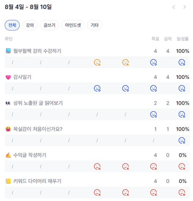 과제 제목: [닉네임] 월부월백 실전반 - 1주차 목실감 인증 및 주간 회고! (8/7 ~ 8/10) STEP1. 1주차 목실감 인증 목실감 - 통계 - 주간/월간으로 들어가 이번주 나의 목실감 현황을 인증해주세요 STEP2. 주간회고 나의 주간 실적을 확인해보며, 어떤 부분을 잘 했고, 어떤 부분이 부족했는지 스스로를 되돌아봐주세요!😊 금주는 강의 수강