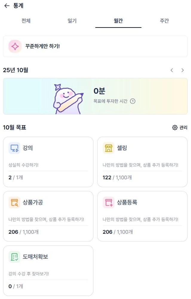 ✅챌린지 시작 전, 현재 등록 상품 수 인증하기 Q. 구글 폼 제출 완료하셨나요? (링크 10/14 안내 예정) 네 1. 한 달간 총 목표 등록 수: 2,300개 2. 주차별 목표: - 1주차 500개 / 2주차 600개 / 3주차 600개 / 4주차 600개 3. 시간 배분 계획 (하루 몇 시간, 어떤 시간대 등): - (평일) 하루 약 8시간 투자(주로