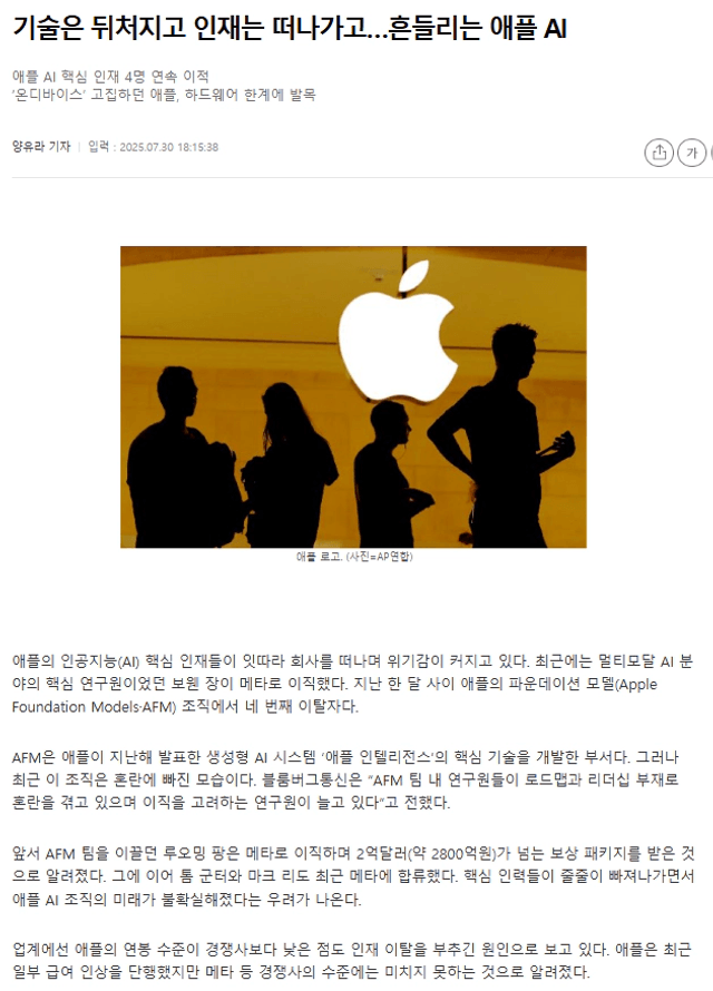 최근 AI기술에 대한 기대가 높은 가운데 애플은 경쟁사인 삼성전자, 구글 대비 AI기능 기술이 뒤쳐지고 있다. 애플은 기술보단 디자인 및 충성 고객을 다수 보유하고 있어 현재의 위치를 유지하고 있으나 AI기술 개발이 계속해서 부진하다면 향후 소비자는 등을 돌리게 될 것이고, 이는 주가 하향에 영향을 줄 것이라 생각한다. https://kr.investing