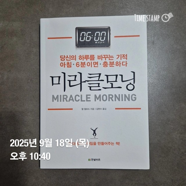 책 제목 : 미라클모닝 저자 및 출판사 : 할 엘로드 / 한빛비즈 읽은 날짜 : 2025.09.18. 핵심 키워드 3가지 뽑아보기 : #아침의 기적 #'상황'이 아닌 ‘삶’ #삶을 구원하는 6가지 습관 도서를 읽고 내 점수는 (10점 만점에 ~ 몇 점?) : 10점 *이 책을 통해 무엇을 얻고 싶은가? (목차를 보고 배우고 싶은 목표 정하기) : 아침 시간