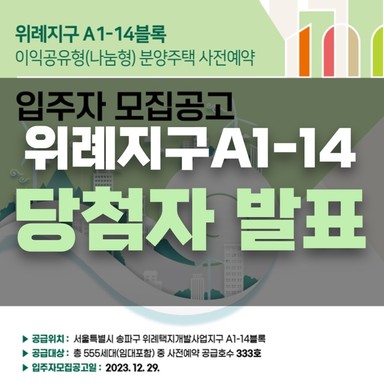 [송파구 거여동 부동산] 위례지구A1-14블록 이익공유형 분양주택 당첨자 발표!!(접수결과, 경쟁률, 시세차익)