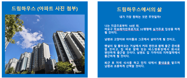 1️⃣ 열심히 정리한 내집마련 보고서 1주차 파트 (엑셀 & PPT 양식에 맞추어) 화면 캡쳐 이미지 첨부 (작성 후 캡쳐하여 사진 업로드) 2️⃣ 스스로 작성해보면서 느낀점을 한 줄이라도 적어봅시다 :) 스스로 느낀점을 작성하면서 앞으로 어떤 부분을 보완할 수 있을지 어떻게 나아가면 될지 돌아볼 수 있을거에요. 드림하우스와 내집마련보고서를 작성하면서 스스